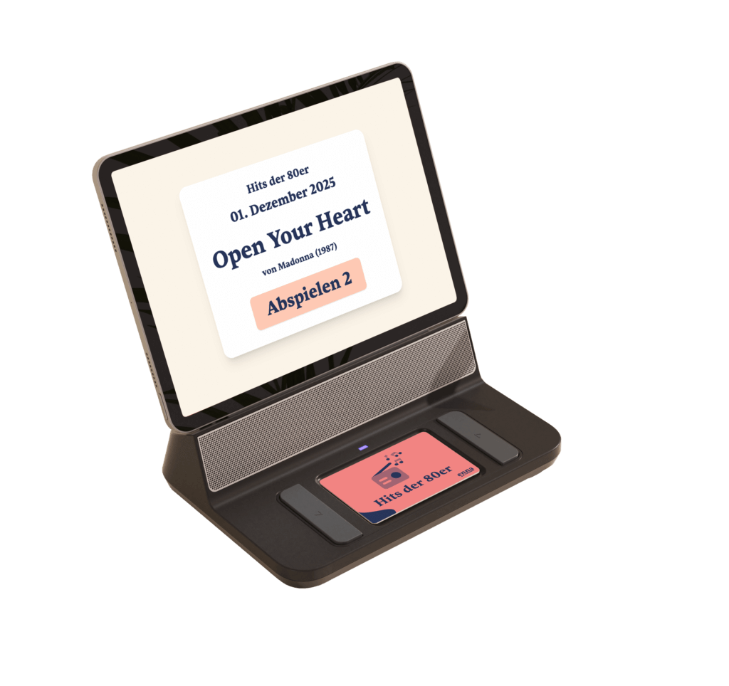 Mit dieser enna Karte schenkst du Oma oder Opa jeden Tag ein Stück 80er-Jahre-Gefühl: Synthesizer-Sounds, große Pop-Hymnen, Rock-Klassiker und unvergessliche Lieblingssongs. Einfach die Karte auf das enna Dock legen – und es startet ein bekanntes Lied aus den 80ern, sorgfältig ausgewählt für gute Laune und schöne Erinnerungen. Am nächsten Tag folgt automatisch der nächste Hit.